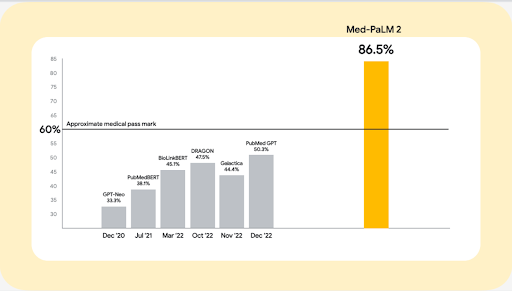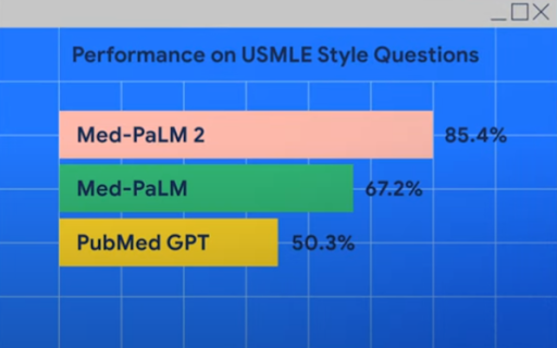 Огляд презентації Google Med-PaLM 2 показує, що при точності моделі 67,2 % вона суттєво випередила своїх найближчих конкурентів (з урахуванням того, що Google часто вибірково демонструє дані у публічних презентаціях).