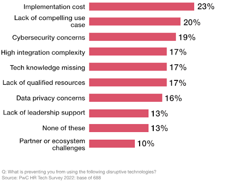 Аналітика PwC підкреслює чинники, які стримують впровадження технологічних рішень у компаніях (див. діаграму).